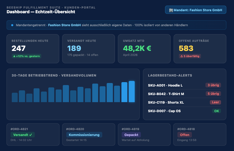 beeShip's neues Fulfillment Suite Kunden-Portal dreht die Logik um. Anstatt Händler-Kunden in der Dunkelheit zu lassen, gibt das Portal jedem Mandanten einen Live-Einblick in seinen eigenen Bereich — kontrolliert, mandantengetrennt und ohne IT-Aufwand.